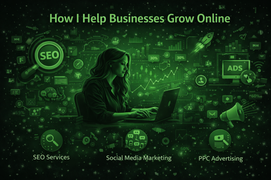 I offer Social Media Marketing, SEO, Google Ads, Content Marketing, and Website Development.